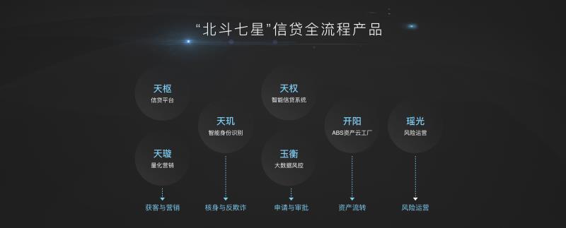 “北斗七星”包括了信贷平台、量化营销、智能身份识别、智能信贷系统、大数据风控、ABS资产云工厂、风险运营七大模块,可以帮助银行打造前、中、后端平台,涵盖从系统搭建到获客、风控、用户运营、贷后管理、资产处置等业务全流程中的每个节点。“北斗七星”的七个模块之间技术无缝对接,数据相互关联,在帮助银行提高效率的同时,也通过穿透资产实现实时把控风险。