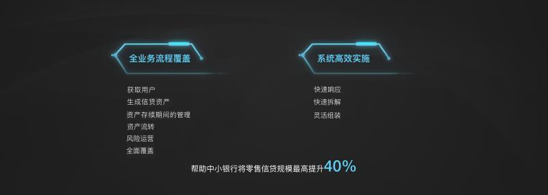 一方面,借助于“北斗七星”的全流程一站式服务,中小银行可以低成本快速搭建系统,从零启动业务上线,将原来至少半年的业务筹备期缩短到一个月;另一方面,“北斗七星”中的各个模块也可以解耦出来,向银行提供定制化服务。
